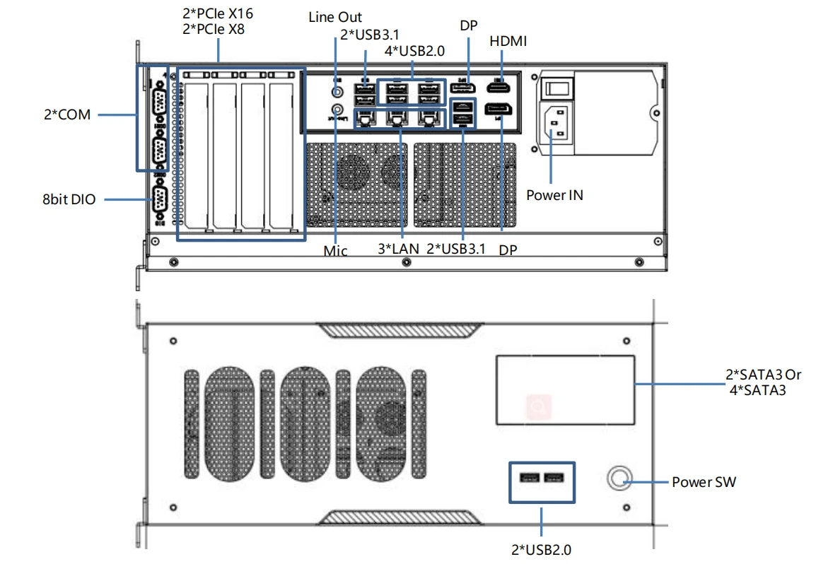 I/O ports | 3*RJ45 Gig-LAN 4*USB3.1 Type A; 6*USB2.0 Type A; 1*USB2.0 Type A(inside) Optional 8-bit DIO (DB9), 2*RS232/422/485(DB9) Audio-out and 1*MIC (3.5mm phone jack) 1*HDMI +2*DP | |