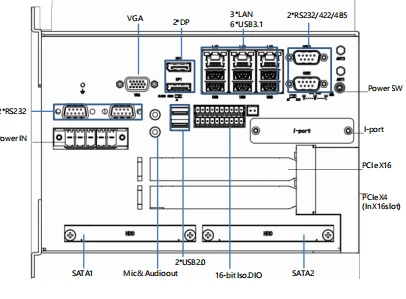 I/O ports | 3*RJ45 Gig-LAN, 6*USB3.1; 2*USB2.0 16-bit Iso. DIO, 2*RS232/422/485, 2*RS232 Audio-out and 1*MIC 1*VGA+2*DP | |