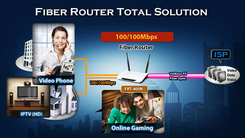 | Delivering High-Demand Service Connectivity for ISP / Triple Play Devices The FRT-405N is the ideal solution for FTTH (Fiber-to-the-home) applications. With built-in 100Base-FX fiber interface, the FRT-405N supports different optic types for WAN and the distance can be up to 15~60 km through the Fiber connection. It can handle multiple high-throughput services such as IPTV, on-line gaming, VoIP and Internet access, and keep the bandwidth usage smoothly. The FRT-405N also incorporates a 4-port 10/100Base-TX switching hub, which makes it easy to create or extend your LAN and prevent the attacks from Internet. |