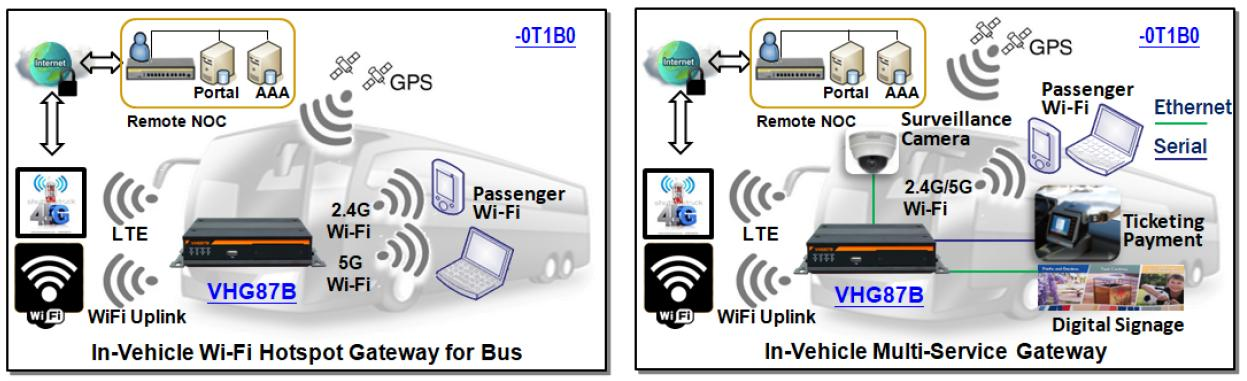 Providing Internet and WiFi access to riders has become an essential service. VHG87B-0x1B0 equip dual WiFi radios that can support con-current 2.4GHz and 5GHz dual-band WiFi hotspot for buses or tourist coaches. Working with external portal server enables an efficient way of user authentication and billing. QoS and bandwidth management also guarantee a better quality of experience.