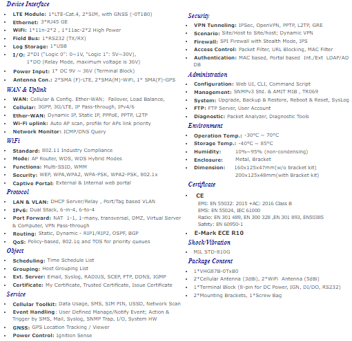 VHG87B-0x1B0 are Cat-4/6 LTE-based gateways that bring simplicity to wireless connection process. With worldwide LTE spectrum, it enables WAN connectivity for moving vehicles and contribute a reliable bi-directional communication for other on-board electronic devices. Intelligent network monitoring allows VHG87B-0x1B0 to re-connect automatically or fail over to alternative SIM.