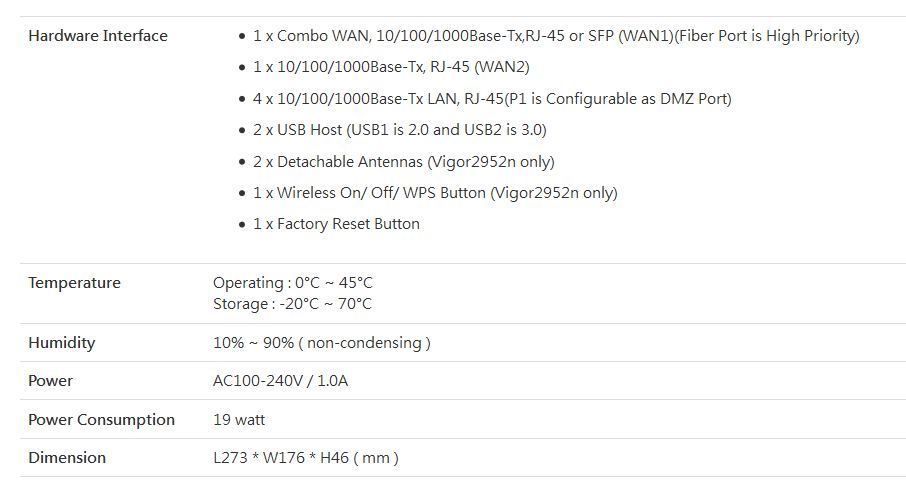 DrayTek Vigor2952 series Dual WAN serves as a VPN gateway and a central firewall for multi-site offices and tele-workers. With its high data throughput of two-Gigabit Ethernet, Dual WAN, VPN trunking and 4 Gigabit Ethernet LAN ports, the device facilitates productivity of versatile business operations. To secure communications between sites is the establishment of VPN tunnels up to 100 simultaneous tunnels (including 50 SSL VPN tunnels).